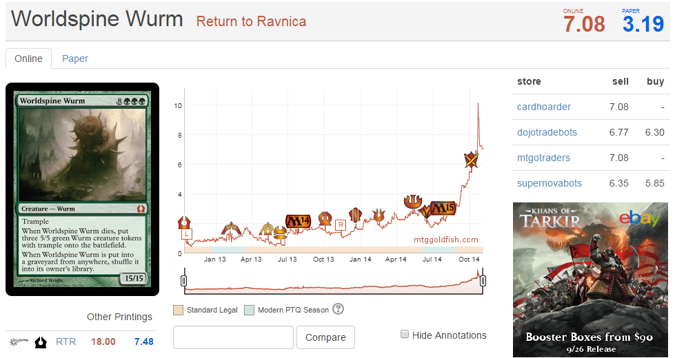 During its time in Standard, Epic Experiment was between $1 and $2. Necropolis Regent never even hit a dollar, nor did Utvara Hellkite. Worldspine Wurm was under a dollar, too, and now it's the second-most expensive card in the set, behind only Sphinx's Revelation.