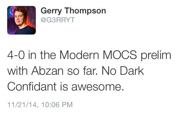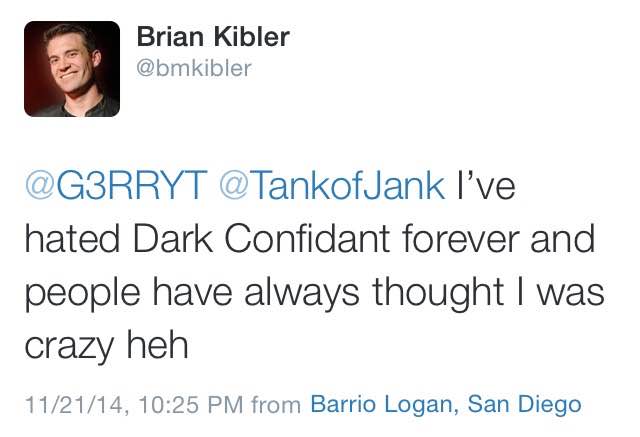 Modern's second-most expensive card is a different story. Dark Confidant has fallen out of favor in Modern in a big way—it doesn't even fall in the top 50 of Modern's top staples! Furthermore, we had this exchange take place on Twitter recently:
