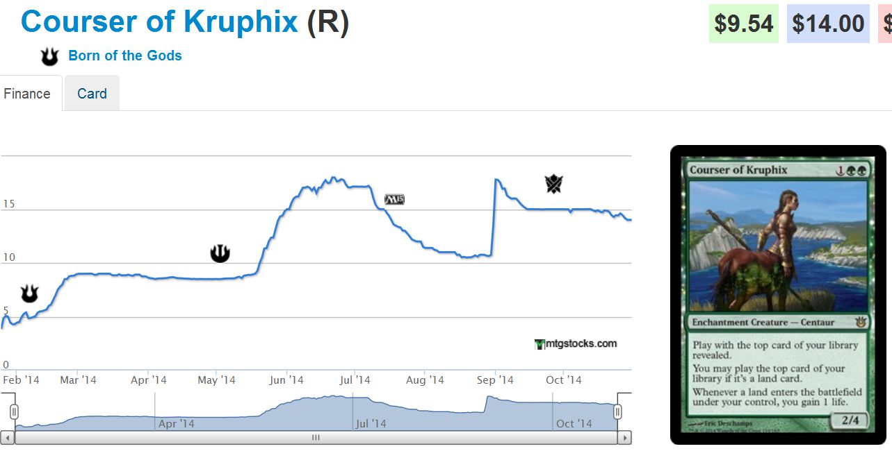 What I want to re-emphasize this week is that the trend, which could have been prematurely called a “trend” last week, is now solidifying. In other words, what started off as a small pullback after rapid over-extension appears to be a true downward trajectory. Take Courser of Kruphix as a prime example and note the continuation of last week’s decline into this week.