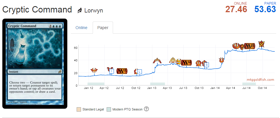 The first Modern Masters drove down prices briefly, but not for long. Tarmogoyf and Dark Confidant went up from their pre-reprint prices, with 'Goyf basically doubling since then. Cryptic Command dipped slightly, then proceeded to reach unprecedented highs in the following year.