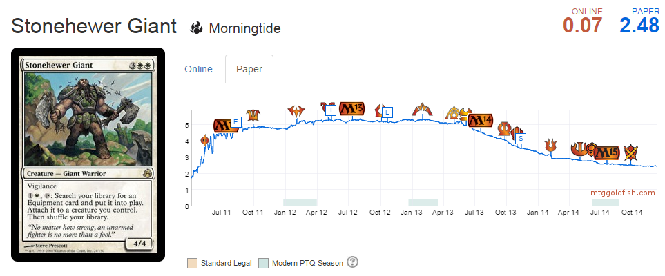 The main cards that took seemingly permanent hits are the casual staples that don't see play in Modern. Stonehewer Giant, for example, was at its all-time high before being reprinted; now it's at half the price and has continuously dropped since Modern Masters.