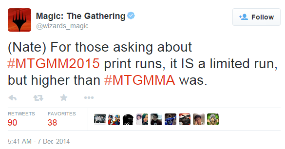 But the fact that it's higher means that this set's impact on card prices will likely be slightly different that the first Modern Masters—unless the $9.99 MSRP offsets the higher print run exactly, I suppose. Until there's observable data, though, we can't really know for sure.
