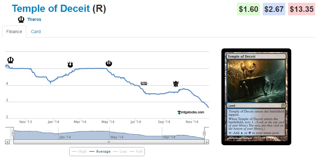 But that logic isn't enough, because that would imply that while the aggro colored lands (Temple of Triumph, Temple of Abandon) could be really cheap, the control ones (Temple of Enlightenment, Temple of Deceit) should have gone up. And they seem to do okay in midrange decks, which are a large portion of the metagame now.