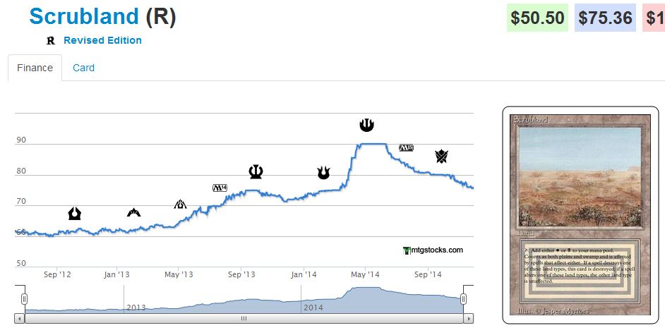 But in the case of dual lands and other Legacy staples, we simply aren’t there yet. Despite the lower prices, inventory of duals have soared. Star City Games, the world’s largest MTG retailer, has recently dropped their prices on duals., yet they have 77 Revised Scrublands in stock at the time of this writing. There are over 100 Tropical Islands! Even the most popular dual Land, Volcanic Island, is still plentiful (although still $299.99 for NM).