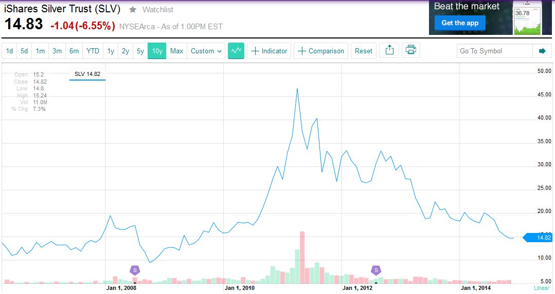 I’ll admit these two charts don’t match up perfectly. On the Scrubland chart, x-axis is too narrow and the y-axis not steep enough to match the chart for silver (via the SLV externally traded fund) perfectly.