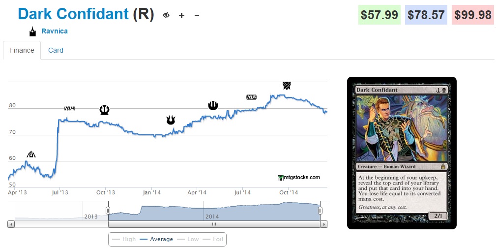 #5 Dark Confidant (-2.08%) - The demise of Jund as a tier 1 strategy in Modern is all but consummated, due to the banning of Bloodbraid and Deathrite--and the fact that the power of Thoughtseize and targeted discard just doesn't cut it when your opponent can draw three cards for one blue mana. This once-proud staple has been sitting on the sidelines recently, and unless a banning/unbanning occurs, I don't expect him to see any resurgences.