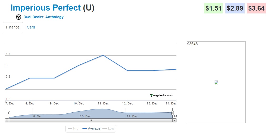 #1 Imperious Perfect (+43.8%, Duel Decks: Anthologies) - This one is likely due to the fact that DD: Anthologies is supposed to be a more limited run. While we tend to see Duel Decks with several printings, my LGS owner told me that he ordered the maximum number he was allowed to (15) from his distributor. This implies that unlike Sorin vs. Tibalt we're unlikely to see them rotting on shelves for several months as they are pretty chock full of value.