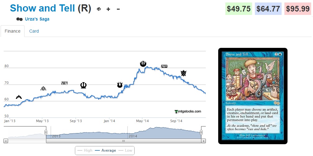#4 Show and Tell (-2.87%) - Sneak and Show decks have really taken a back seat as the blue-red deck of choice for Legacy. If your only four dual lands are Volcanic Islands, you'll likely see more success with U/R Delver than Sneak and Show (which has a hard time implementing its game plan against decks packed with counterspells and cheap/efficient threats.