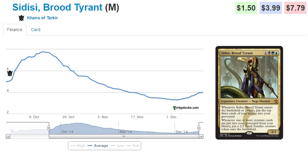 I am honestly not sure what the call is on foil Khans fetches. I think picking up the non-blue ones for around $40 isn't a terrible play (3.5-4x their regular version), but the fact that the blue ones are close to $80 (or 5x their regular price) may imply that there is a bit of room for them to trend downward, though long-term I think they will see strong growth. The biggest concern with these is that since they are foils of reprints, any additional reprints will likely deflate the price of these foils (though not affect the original set print foils).