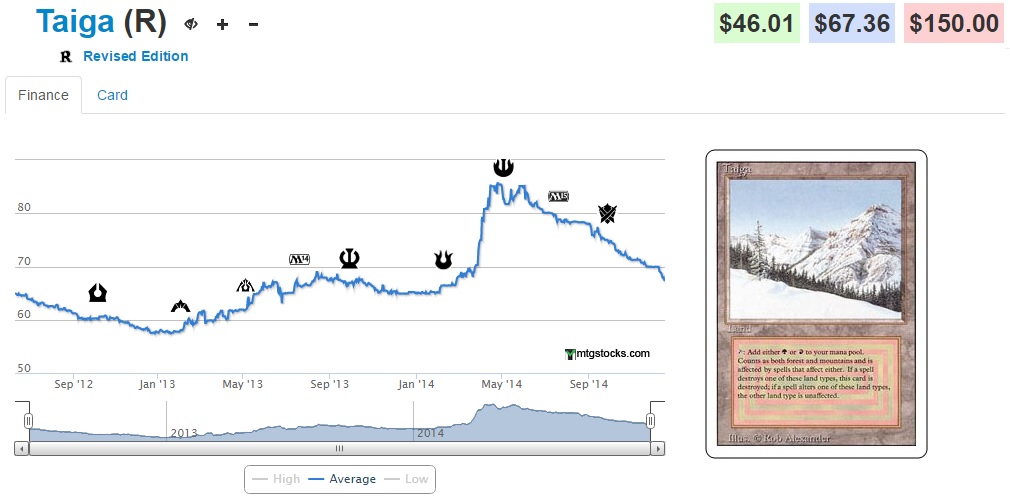 #2 Taiga (-3.81%) - Again we see the continued downward trend of most of the dual lands which are still receding from their original spikes back in April/May. This is just further evidence that this spike was market manipulation and that in fact the true market can't endure these prices for duals. It doesn't help that poor Taiga (which was the backbone land of Zoo decks) has almost no home in tier 1 Legacy strategies (outside of a one-of in Jund).
