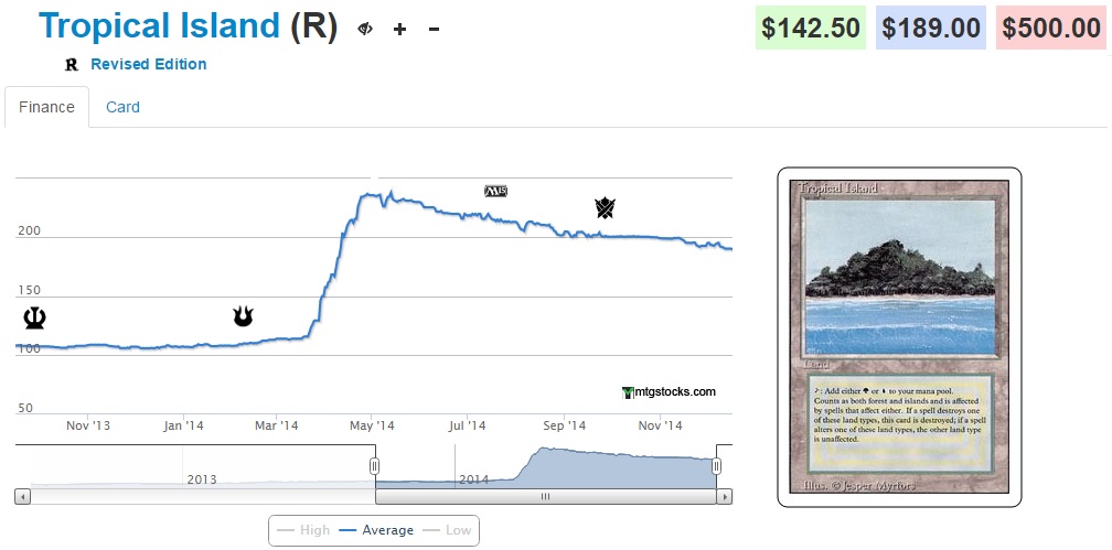 #3 Tropical Island (-3.04%) - Well as much as my friend Daniel wants RUG to have a resurgence, this pretty large drop in price for the key land of RUG (because let's be honest Nimble Mongoose and Tarmogoyf are the real threats of the deck) shows that despite a minor resurgence in Top 8s the deck still has a long way to go if it ever hopes to reach its previous dominance of the format.
