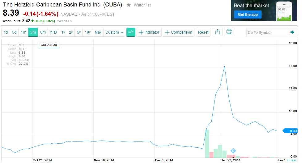 After hearing this news, I did a swift search at my stock broker’s website for any stock that has major focus in Cuba. My search failed, but a short time later I read about an Externally Traded Fund (ETF) that tries to assemble stocks that at least have some business in Cuba. Ticker symbol: CUBA (convenient, right?).