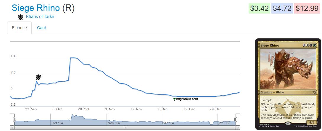 First, we have Siege Rhino. This creature has been on a steady incline over the past few weeks (when I called the bottom) as it gains more and more traction across multiple formats. Despite a superfluous amount of copies in existence, demand is still outpacing supply to drive this card higher.
