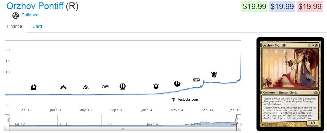 I understand your frustration. I think one thing you need to keep in mind is that these spikes happen literally overnight. By the time our articles go live, another spike/buy-out can occur. With these happening so haphazardly, it’s difficult to predict an actual spike. I always try to provide ideas for where to invest and what to trade for, but I can’t just say “Gilt-Leaf Archdruid is about to get bought out, so buy those now” because I can’t predict this precisely. I can see that it’s moving upward, and I know it’s from an older set…so it feels like a good candidate. But yesterday it was Chalice of the Void’s turn. The day before it was Orzhov Pontiff’s turn. Tomorrow it may be something else, like Amulet of Vigor again. Who knows?