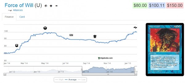 #1 - Force of Will (+2.82%) - With the shift in the Legacy metagame towards blue-based tempo decks (of which FoW is a staple), it's not surprising to see FoW continue its upward trend. However, with the banning of Treasure Cruise in Legacy, the aggro-control (or tempo) U/R/x decks will likely see a drop in percentage of the metagame and players will revert back to a more pre-Khans style format. This is still good news for Force of Will which is still a major player in many of those decks.