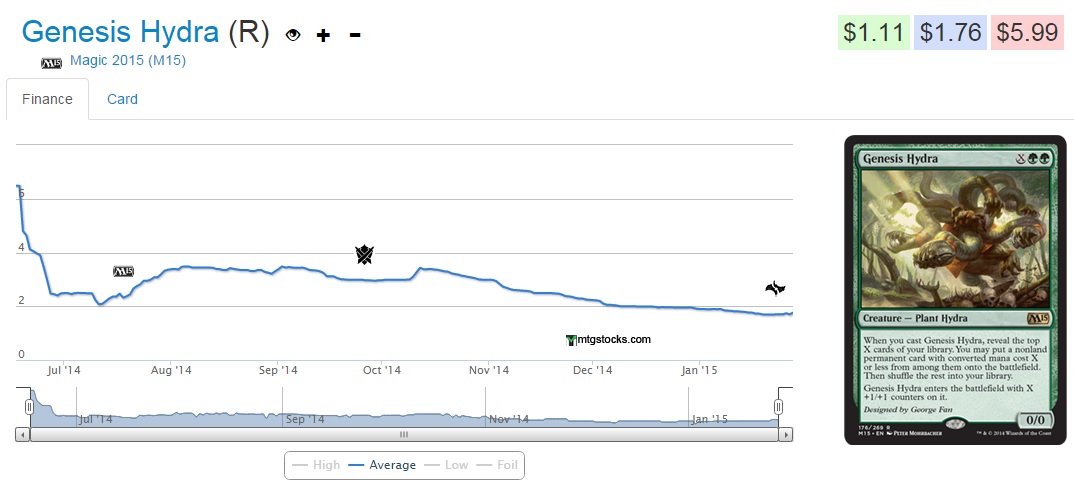The fact that this key piece is a rare from a poorly-received set means that he has higher potential than say a Khans rare like Temur Ascendancy. If we see this combo deck take down an SCG Open in the near future, you can expect Genesis Hydra to jump quite a bit (he's already at $4 on SCG, so they are expecting higher demand for him).