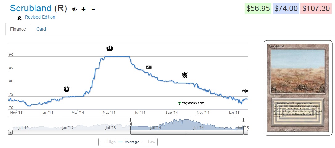 #2 - Scrubland (-2.13%) - Not surprisingly we see one of the non-blue duals continue a downward trend. There is some hope for the Esper Stoneblade decks to once again rise in prominence (as Treasure Cruise decks lost their main source of card advantage) so we could very well see a bounce for Scrubland. But until those Esper decks materialize I expect this one will rise/fall around the $75 mark (which was its pre-April price).