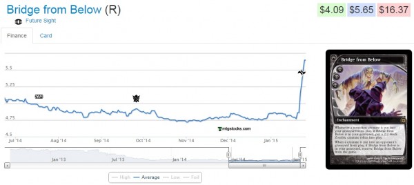 #5 - Bridge from Below (Future Sight) (+18.5%) - As expected one of the many sub $5 cards that plays really well with Golgari Grave-Troll (and isn't banned like Dread Return), this one is riding the coattails of Grave-Troll. However, unless a dredge deck actually materializes, I expect both to sink in value as players try and fail to make a tier 1 deck. If they succeed...then buy more Scavenging Oozes.