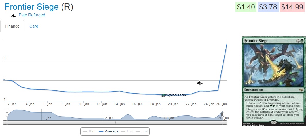 #2 - Frontier Siege (+193%) - This Fate Reforged gem saw significant camera time at the first Fate Reforged-legal Standard Open (SCG DC). Led by Ali-Antrazi's Sultai Ramp deck, it helps power out Ugins and other giant spells. The "dragons" choice with Hornet Queen is also pretty nasty. The important thing is that you could buy these on Saturday on TCG player (as I did for under $1) after watching the SCG coverage.
