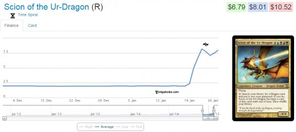 His spike wasn't really all that surprising given the theme of the set. What is interesting is that it took until January 17th for any change, despite the fact that the dragons had all been spoiled before then. The massive and sudden spike does imply a buyout. I expect his price to stay higher than the previous $2, but I wouldn't be surprised to see him drift back down towards the $4 mark.