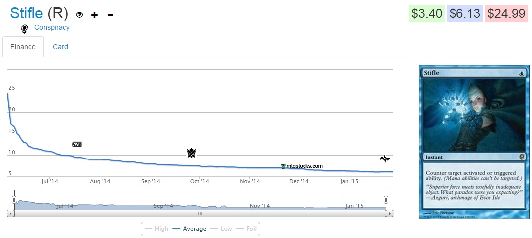 #1 - Stifle - Stifle is still sitting near it's all-time low ($6 for Conspiracy and $11 for Scourge). With the departure of Treasure Cruise in Legacy, expect the older RUG Tempo decks that relied on Wasteland and Stifle to pop back up to keep the combo players in check.
