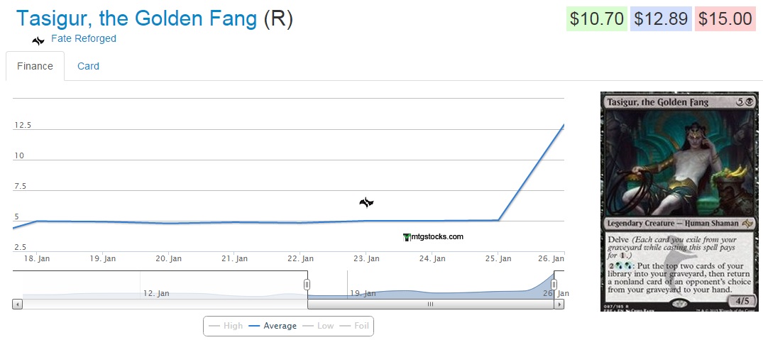 I can't stress enough how important it is to watch the SCG coverage the weekend after a set is released. There's a lot of potential money to be made. Now Tasigur (as cool as he is) is not a $13 card. He jumped up in a day and I expect he'll slowly slide back down as those who jumped on the bandwagon at $10+ will be weary of trading him away when he slips back down to $5 (which he will do as more product is released).