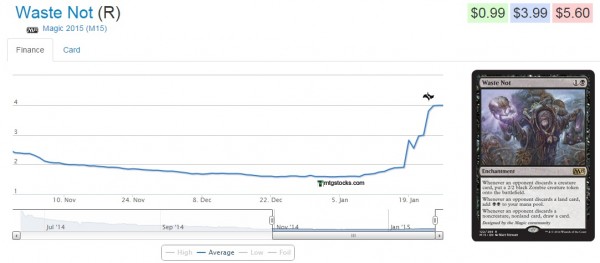 #4 - Waste Not (+41.5%) - Maybe all the discard-happy players missed the spoiling of Dark Deal, maybe they didn't read it until they cracked it in their Fate Reforged pre-release. Either way this card's jump is not likely to stick, unless someone can make a tier 1.5+ Standard deck based around it.