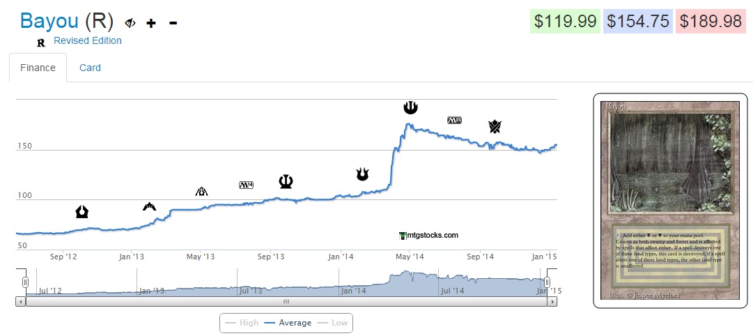 Good article, though not sure I agree with the “dual lands spike was artificial” train of thought. Yes, they all pulled back some after the spike, but this has happened every time they’ve sharply risen for at least the last five years. They spike, they fall down some, they eventually stabilize above where they were before and then drift upward before the cycle repeats. I’m not sure how this is any different. Sure, a few of them have gone back down quite a bit, but the Bayou you also displayed, for instance, is already rising back to that high-water mark.