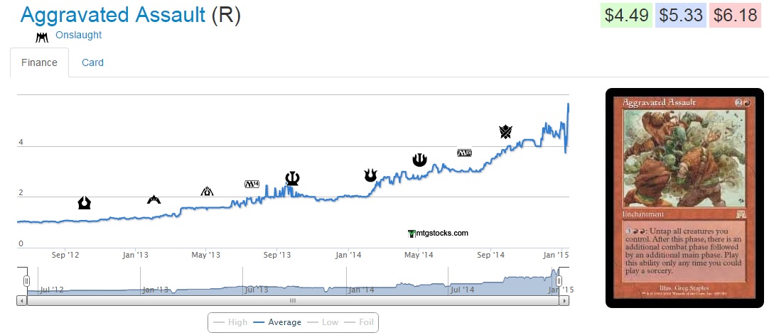 #1 Aggravated Assault (+42.5%) - This one isn't a surprise. It's a very solid EDH card that combos really well with Sword of Feast and Famine and Bear Umbra or any other effect that untaps lands on combat damage. I mentioned this one weeks ago when I talked about the other Narset cards that had spiked and I expected this one to follow suit. This one has a lot going for it (single printing in an old set, combos in EDH, mono-colored) so it can go in a larger number of decks.
