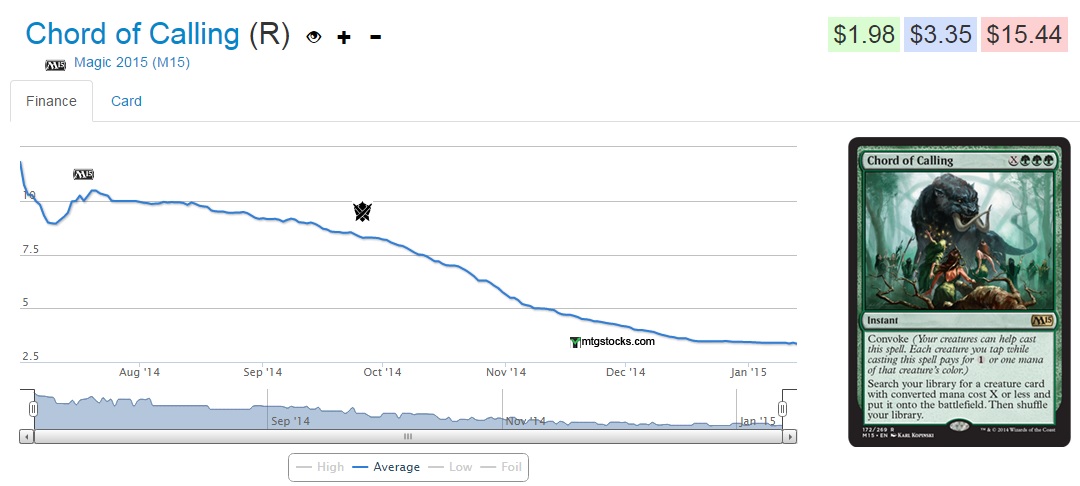 #2 Chord of Calling (M15) - Birthing Pod decks used to run this as a one- or two-of and it was $40 freakin' dollars. All of a sudden M15 rolls around and the price plummets and then continues to drop (I remember trading for my personal set when they were $10 thinking there's no way they don't go up from here.) Now you can buy them for $3.50.