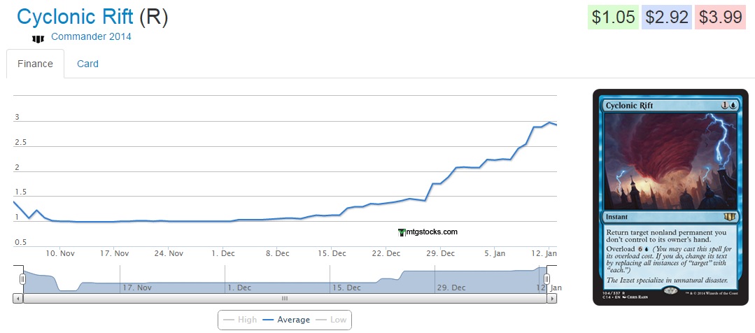 #2 Cyclonic Rift (Commander 2014) (+30.4%) - This one actually made the list two weeks ago as it was $1 back then and had jumped closer to $2. It's continued to rise and is still under the price of a Return to Ravnica copy (which is sitting at around $3 on TCG-Mid). The lack of popularity of the blue deck likely means that there are less of these out there than RtR ones, but the "first printing rule" means that demand for the RtR one will likely remain higher than the Commander 2014 one (although given the past month it's likely they'll get closer and closer until they reach an equilibrium of sorts).
