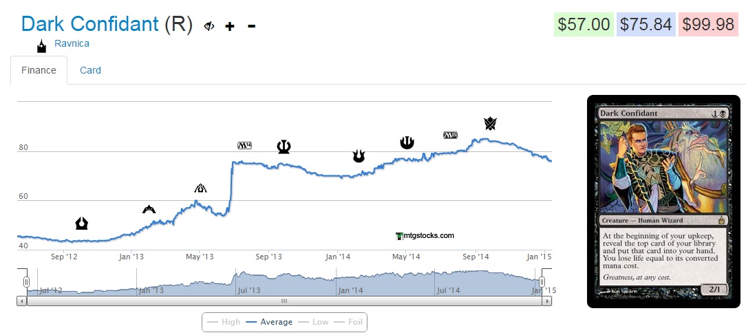 #1 Dark Confidant (-2.76%) - Not surprising, poor Bob continues to trend downward as the Treasure Cruise decks of Legacy/Modern continue to prove that you don't need Bob for pure card advantage in either format. Their dominance also just pushes black back as a whole, as Black's bread and butter (outside of some combo decks) is hand disruption at one black mana. When all it takes is one blue mana (and seven previously used cards) to get three cards back...it's hard to fight that battle.
