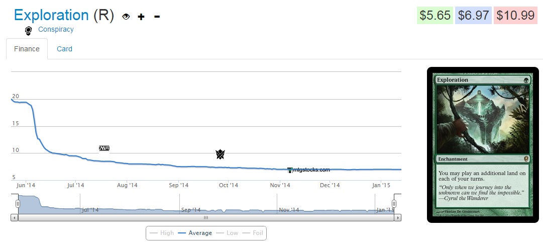 #3 Exploration (Conspiracy) - While both the Urza's Saga version and the Conspiracy version are far lower than I'd expect, the Conspiracy one is sitting at under $7 (TCG-Mid). This is a card that sees occasional Legacy play (in Lands, which when they are doing well cause all kinds of weird spikes like Gamble), but more importantly is amazing in EDH. I rarely run an EDH deck with green that doesn't have Exploration in it as it often serves as a really fast ramp spell that couples well with the typical Cultivate/Kodama's Reach most green decks also play.