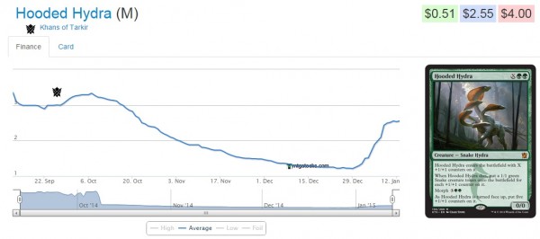 #4 Hooded Hydra (+28.1%) - This card has been getting a lot of hype because of how well it plays with manifest. Because of the similarities between manifest and morph and the fact that his unmorph trigger simply states "when this card is turned face up," people realized that you can use his manifest unmorphing cost to flip him instead of his regular morph cost and get a 5/5 for two green mana. This same trick works with Master of Pearls, but being a regular rare in Khans means that his price ceiling is pretty limited.