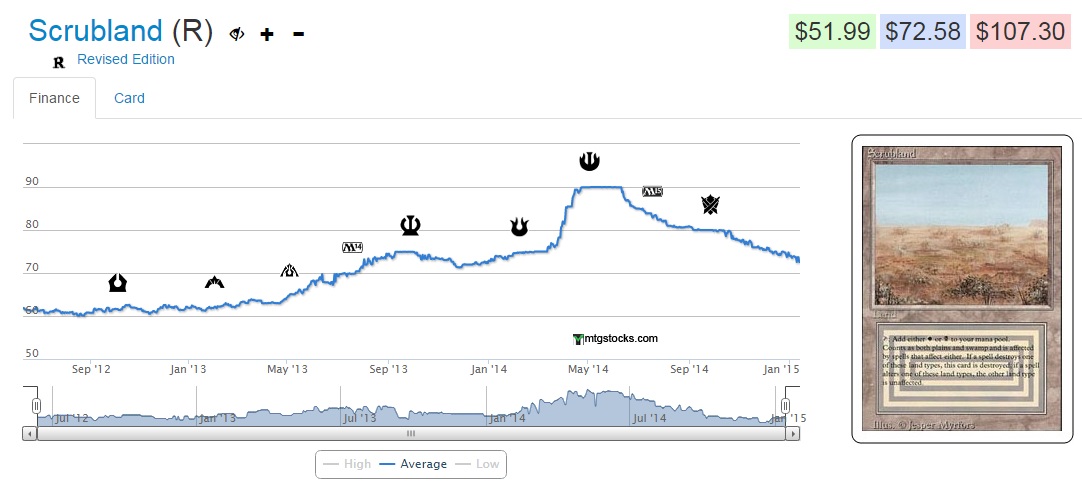 #2 Scrubland (+2.09%) - Finally some positive gains for a dual land that for awhile has either been in the top five movers (almost always downward) or just outside of them (also in a downward trend). Scrubland is finally back to around what it was before the big March/April '14 spike. This again proves that the spike was artificial and the demand wasn't actually there.