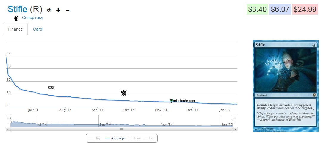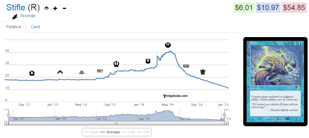 Back in RUG's heyday, Scourge Stifles were $30+ dollars each. Thanks to Conspiracy and the metagame shift they can now be had for under $11 (and the Conspiracy ones can often be found sub $5).