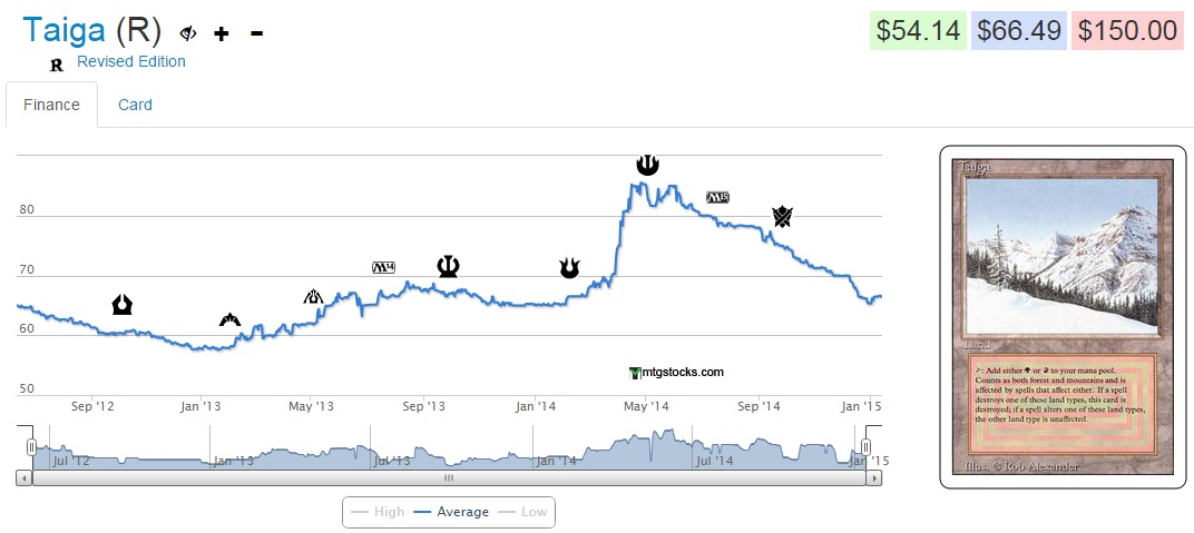 #4 Taiga (+1.66%) - It seems Taiga has finally had a chance to rise in value a bit. It's consistently been on our top five (almost always trending downward) similar to Scrubland and it's nice to see it get a bit of a breather. While seeing very little Legacy play anymore, it happens to be a green dual which is the best color in EDH.