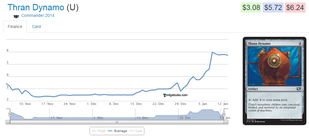 #3 Thran Dynamo (Commander 2014) (+29.7%) - Another Commander 2014 card that showed up in my last article this one continues to rise (similar to Cyclonic Rift) and again was in the blue commander deck. This rise has finally put it on par with its brothers from Urza's Legacy though it still falls below the Archenemy and FTV: 20 printings. I don't expect much more upside to this one though. As you can see by the graph it appears to have plateaued.