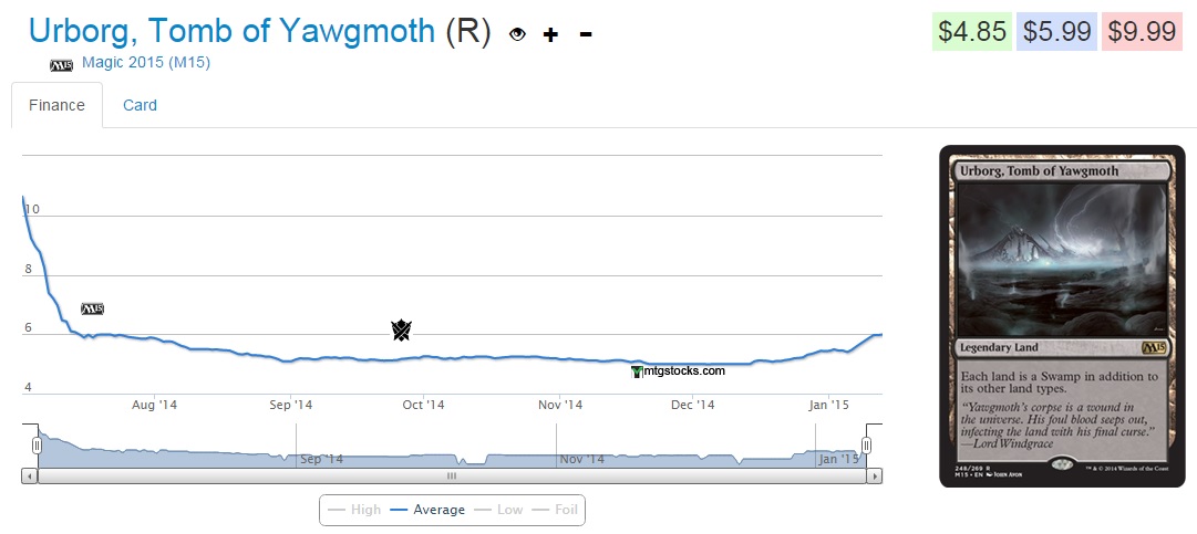 #4 Urborg, Tomb of Yawgmoth - Another recent reprint (you've probably noticed the pattern by now), this was another $40+ card before it's second reprinting (as the FTV: Lands print didn't seem to hurt it at all). The M15 printing obliterated the price though and it was such an odd throw-in that most speculators didn't see it coming. This is another one that's hard to find in trade binders and is often removed from the trade when the other person finds out it's sitting at around $6 (price memory is a very real thing).