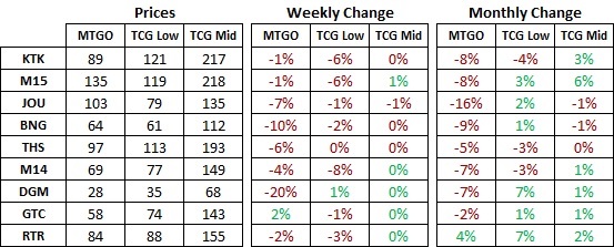 As for Standard legal sets, M15, JOU and BNG are all priced at a premium compared to TCG Low. This means there will be no price support from redemption for these sets, despite falling in price on MTGO in the last month. There are no targets in BNG or M15 to recommend at this time.