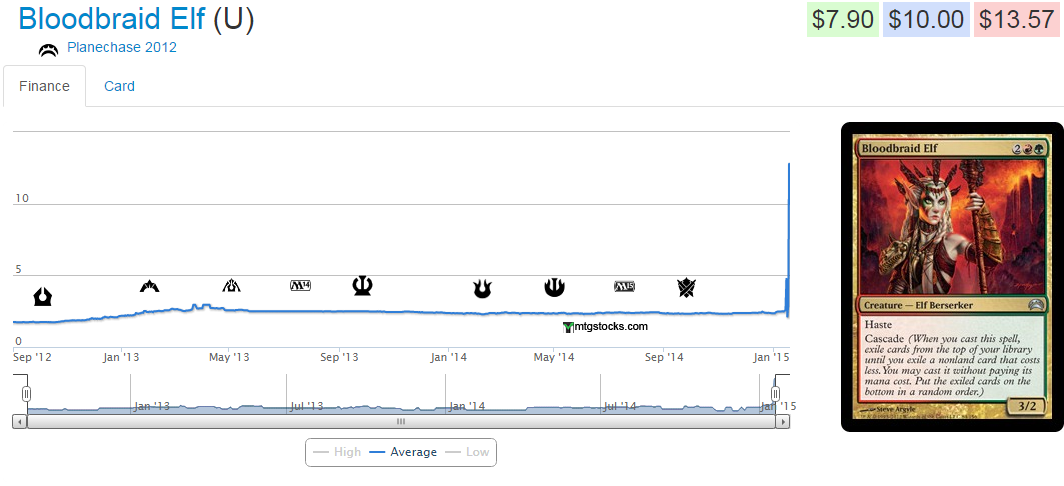 Bloodbraid Elf went stupid bananas expensive based on pure hype and speculation. The Jim Joneses of the Magic community poured some honey in the ears of their flock and they went forth and bought out the internet. After all, Bloodbraid Elf was BOUND to get unbanned, right? Still, there was no concrete proof for this. I was vocal about not wanting to bet my money on Bloodbraid Elf, but the card spiked out of control. It was the most requested card on PucaTrade, signaling everyone on that site that there was a run on the card. Even people in the finance industry who didn't think the card wasn't getting unbanned couldn't convey that information without noting that the card was out of control.