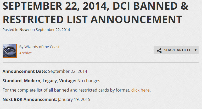 Modern actually looks pretty healthy. Legacy is largely left alone unless something (**cough cough** Mental Misstep **cough cough**) makes that format cartoonish for a while. Standard is healthy and has as dynamic a Top 8 every week as this Modern event did. So the real speculation about bannings and unbannings deals with Modern.