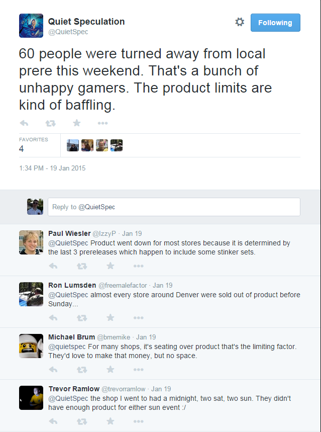 In 2012 prereleases were moved to the store level. Just like every other decision that WotC has ever made, this decision was met with a lot of skepticism. I was greatly saddened, but I got over it as I bought the story that this change would benefit local stores and I believe that this is a respectable objective. That said, every prerelease I see tweets like these: