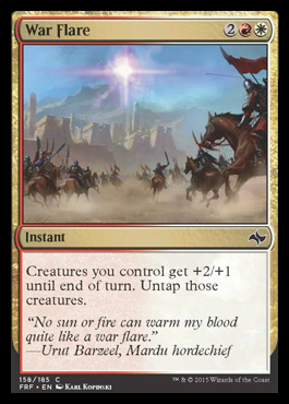 This seems really good. Untapping for a surprise block, going over the top with a horde and dealing 2x damage more than they expected to take or just screwing up combat math, this card is very good for 4 mana at common. Marshall Sutcliffe liked this, too, when he spoiled it and it's easy to see why. This is common, meaning you will commonly see this played. This will be a card to play around and it can really turn the tides of a game. Even the toughness boost is liable to be relevant. All in all, this is a solid card with no financial relevance but with a lot of upside in other arenas.