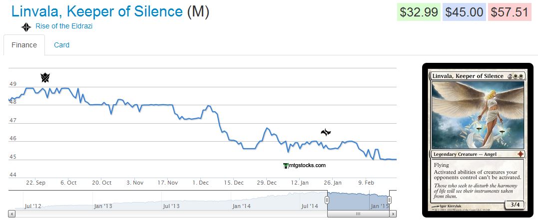 Just ask yet another recently hit card, Linvala, Keeper of Silence. She may be a very difficult to find Angel, but sheās no longer all that relevant in Modern. Now it really is just casual play or Angel collectors propping up her ludicrous price. Needless to say, thereās no upside here.