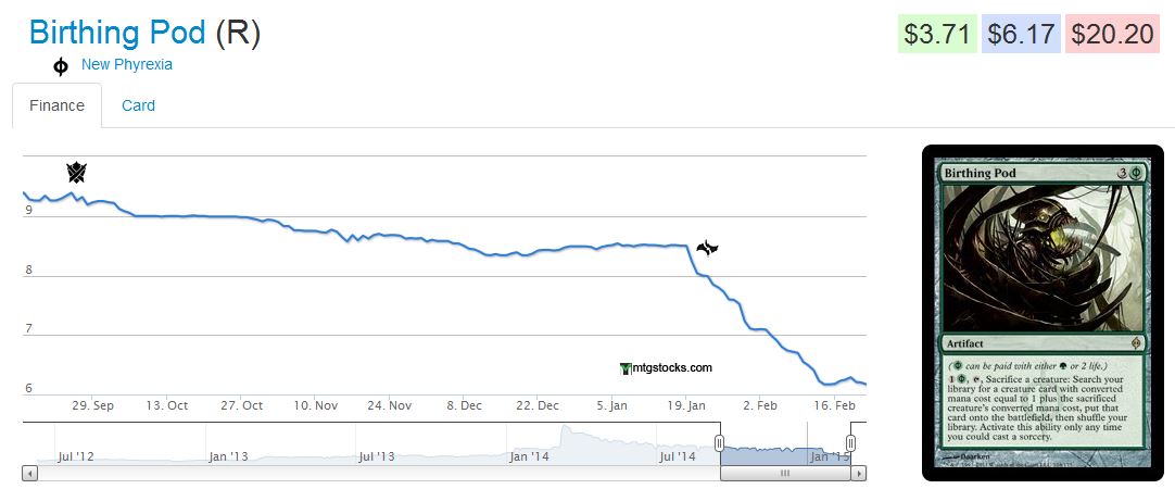 After briefly touching $20, the card swiftly fell back down to $10. But it was the banning of Birthing Pod that buried the hatchet, sending this cardās value all the way down to its pre-spike price of around $6.