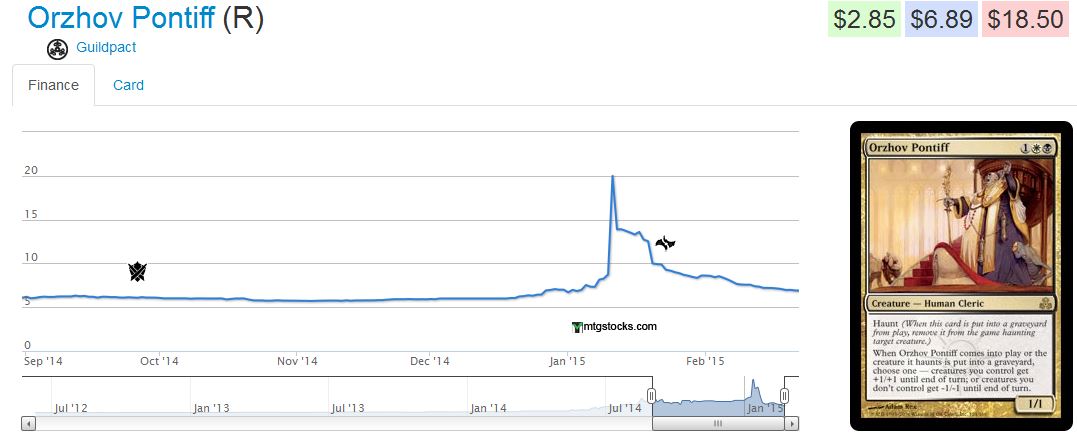 The Orzhov Pontiff chart above is most telling, if you ask me. That card was on an exponential rise, being bought out everywhere as key maindeck and sideboard tech for and against Birthing Pod strategies.
