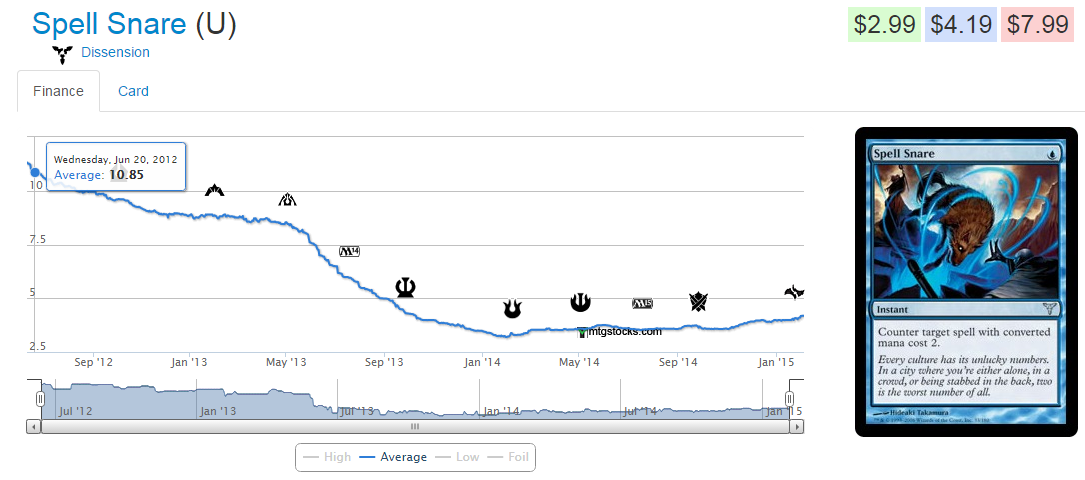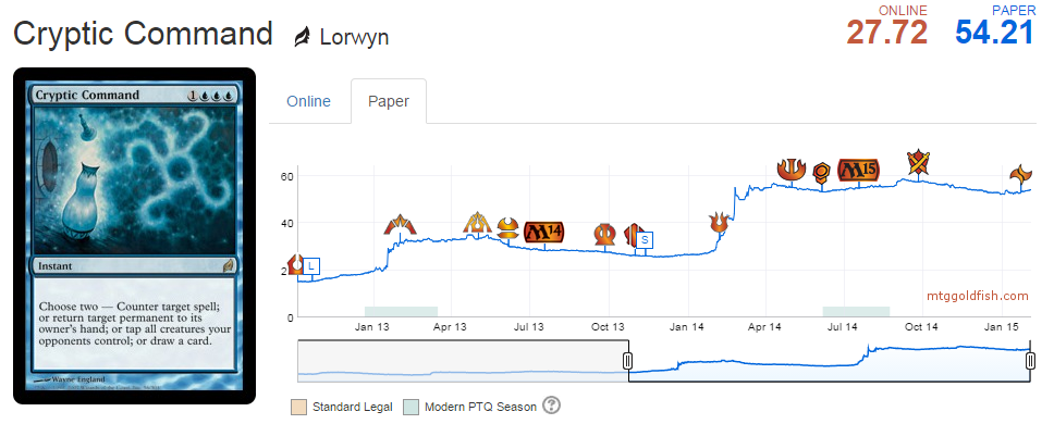 Although I included Cryptic Command in the first category, one could argue it fits more in this one, as the price did drop for a while before gaining on and exceeding its pre-reprint price. I hold that it belongs in the heavy hitters category because it didn't drop very far or for very long, and its gains are unlike most other cards in the set.