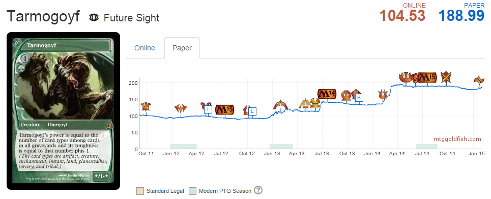 This was true not only of Tarmogoyf, but also of Dark Confidant, Vendilion Clique, and Cryptic Command. Besides Command, all of these are mythic rares, which at least partially explains why the price wasn't pushed down: not enough copies were printed! At the same time, Modern Masters drove up demand for the Modern format, which put a higher demand on the supply that we did have.