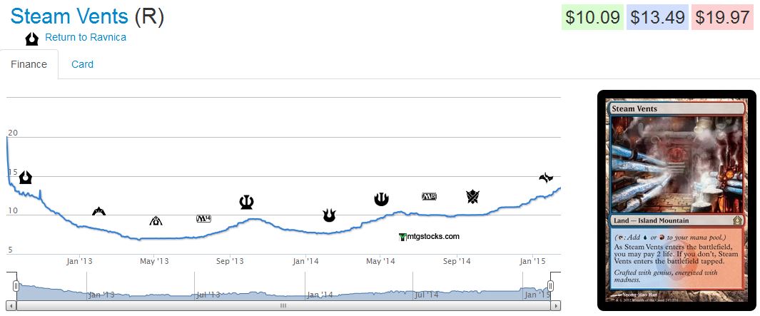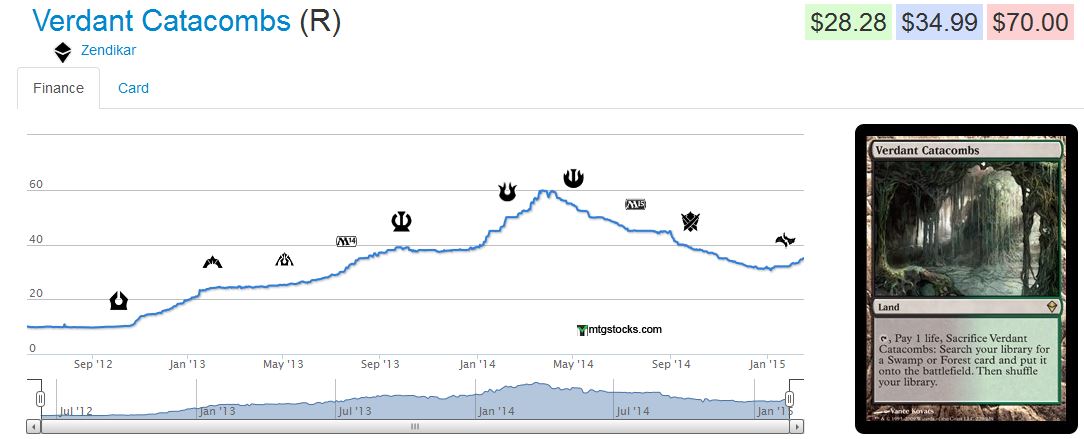Again, I want to emphasize that BOTH Shock Lands and Zendikar Fetch Lands are likely to rise heading into the spring. The Verdant Catacombs chart has the same recent uptick in price as Steam Vents. But when trying to predict future performance weighed against reprint risk, my money is in shocks.